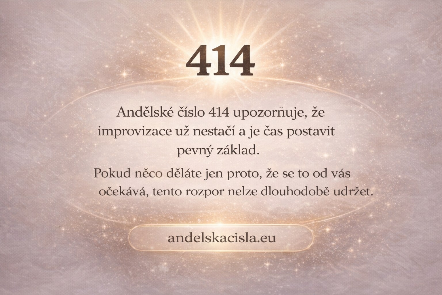 Číslo 414 se obvykle objevuje ve chvílích, kdy se člověk snaží posunout vpřed, ale zároveň cítí, že mu pod nohama chybí pevná půda. Nejde o chaos ani krizi. Spíš o tiché uvědomění, že některé věci stojí na provizoriu a dlouhodobě by neobstály.