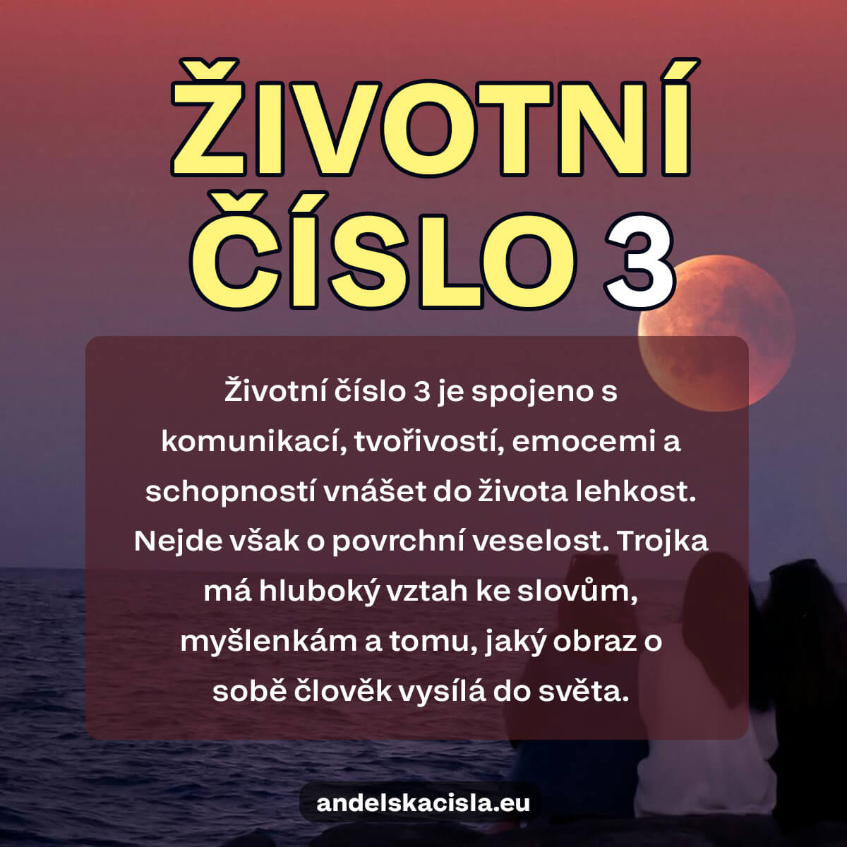 Životní číslo 3 je spojeno s komunikací, tvořivostí, emocemi a schopností vnášet do života lehkost. Nejde však o povrchní veselost. Trojka má hluboký vztah ke slovům, myšlenkám a tomu, jaký obraz o sobě člověk vysílá do světa.